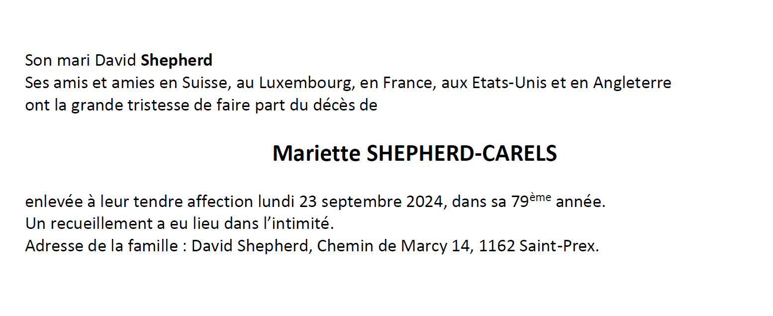 Madame Mariette SHEPHERD-CARELS 01 nov. 1945 - 23 sep. 2024 Avis mortuaire PFG Télecharger PDF Partager sur: Galerie