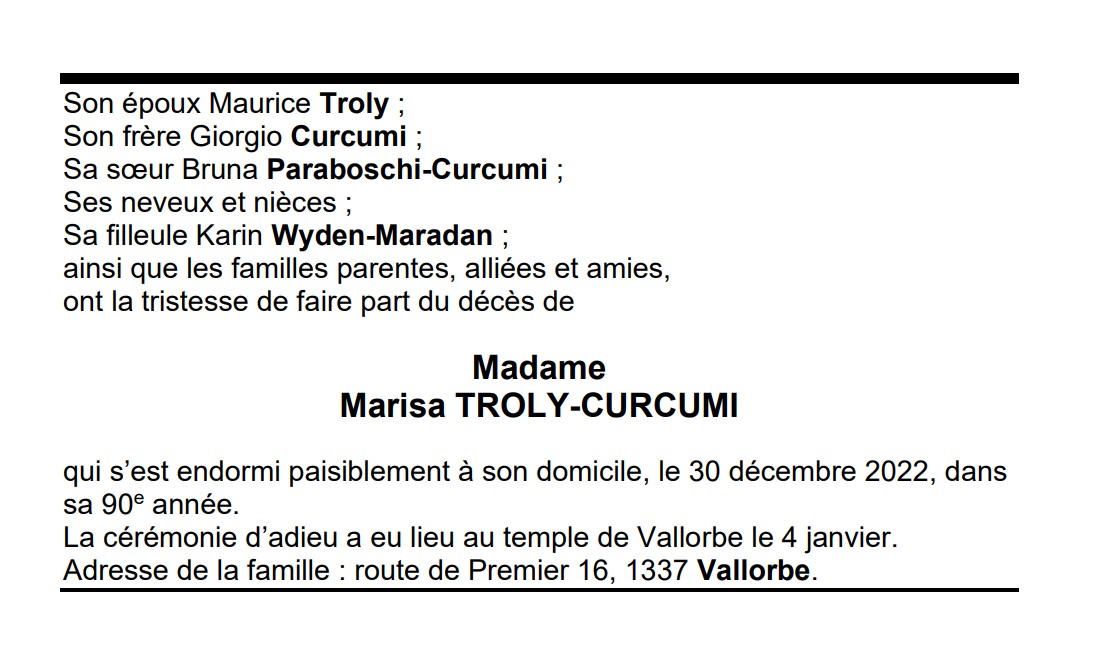 Madame Marisa TROLY-CURCUMI 14 fév. 1933 - 30 déc. 2022 Avis mortuaire PFG Télecharger PDF Partager sur: Galerie PreviousNext PreviousNext