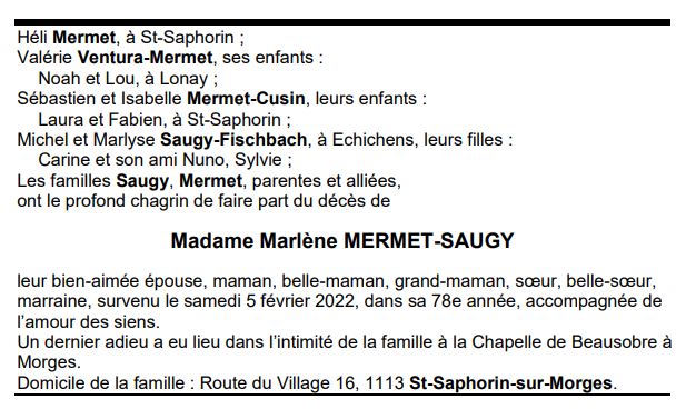 Madame Marlène MERMET-SAUGY 15 avr. 1944 - 05 fév. 2022 Avis mortuaire PFG Télecharger PDF Partager sur: Galerie PreviousNext PreviousNext
