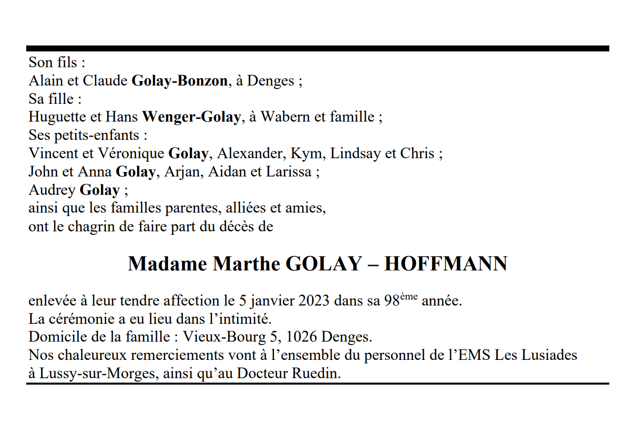 Madame Marthe GOLAY – HOFFMANN 27 fév. 1925 - 05 jan. 2023 Avis mortuaire PFG Télecharger PDF Partager sur: Galerie PreviousNext PreviousNext