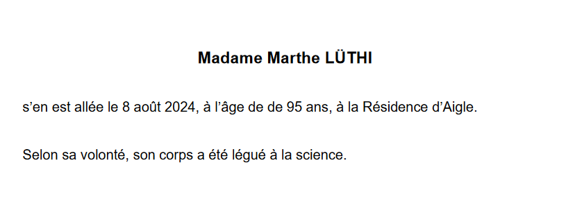 Madame Marthe LÜTHI 22 avr. 1929 - 08 aoû. 2024 Avis mortuaire PFG Télecharger PDF Partager sur: Galerie