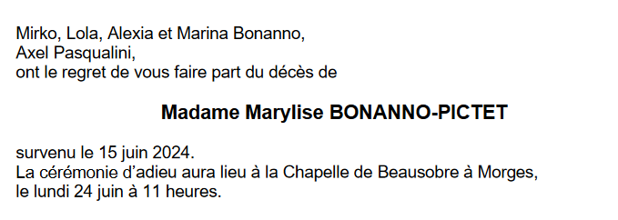 Madame Marylise BONANNO-PICTET 26 fév. 1941 - 15 juin. 2024 Avis mortuaire PFG Télecharger PDF Partager sur: Galerie