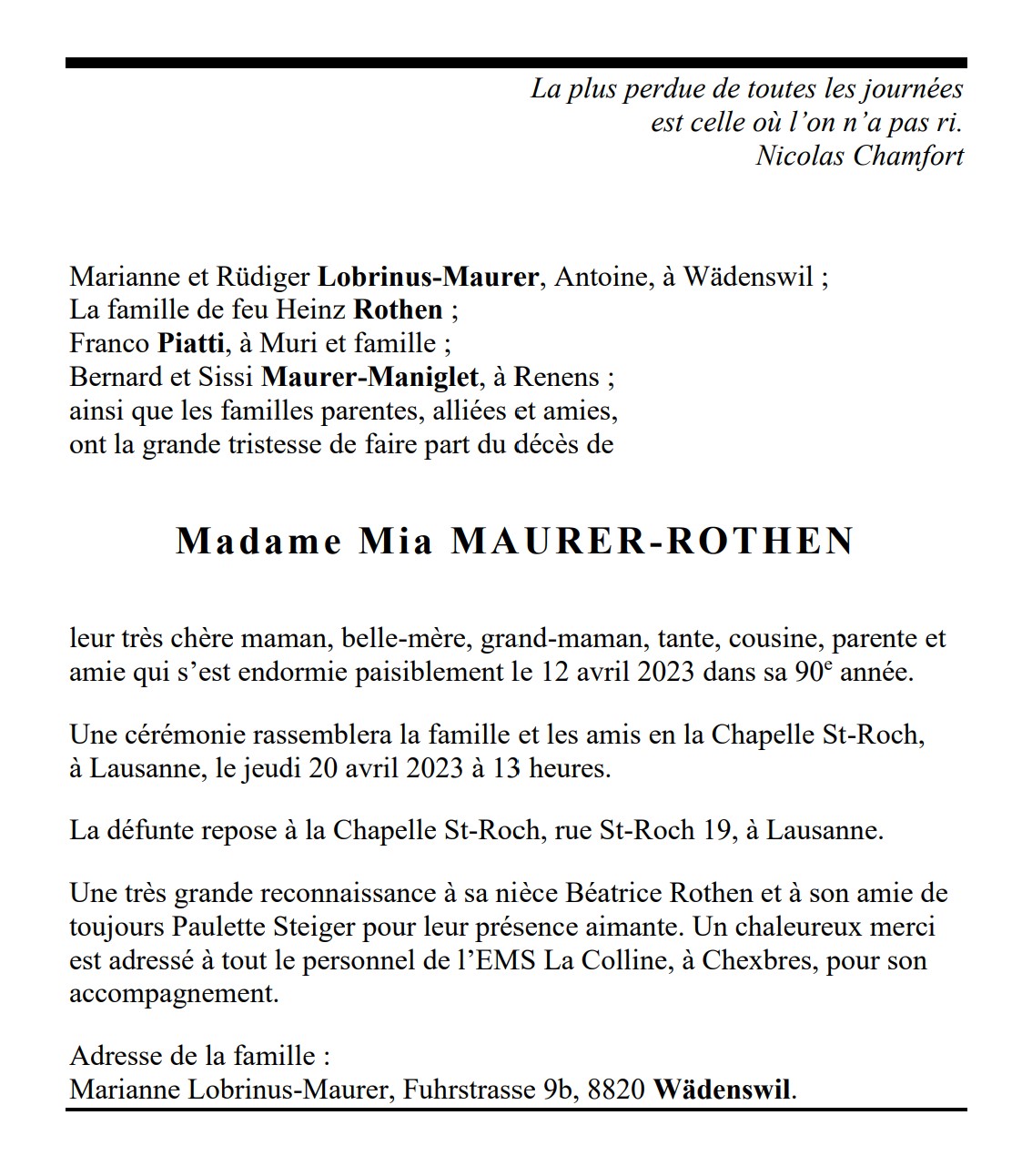 Madame Mia MAURER-ROTHEN 05 oct. 1933 - 12 avr. 2023 Avis mortuaire PFG Télecharger PDF Partager sur: Galerie PreviousNext PreviousNext