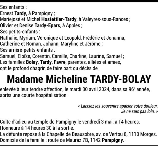 Madame Micheline TARDY-BOLAY 28 mai. 1928 - 30 avr. 2024 Avis mortuaire PFG Télecharger PDF Partager sur: Galerie