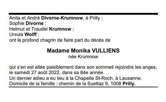 Madame Monika VULLIENS 23 déc. 1938 - 27 aoû. 2022 Avis mortuaire PFG Télecharger PDF Partager sur: Galerie PreviousNext PreviousNext
