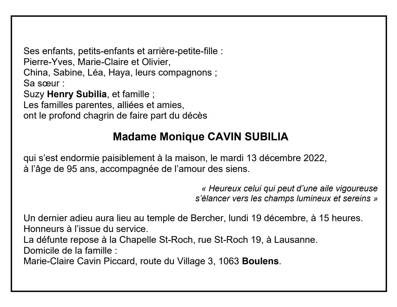 Madame Monique CAVIN SUBILIA 08 oct. 1927 - 13 déc. 2022 Avis mortuaire PFG Télecharger PDF Partager sur: Galerie PreviousNext PreviousNext
