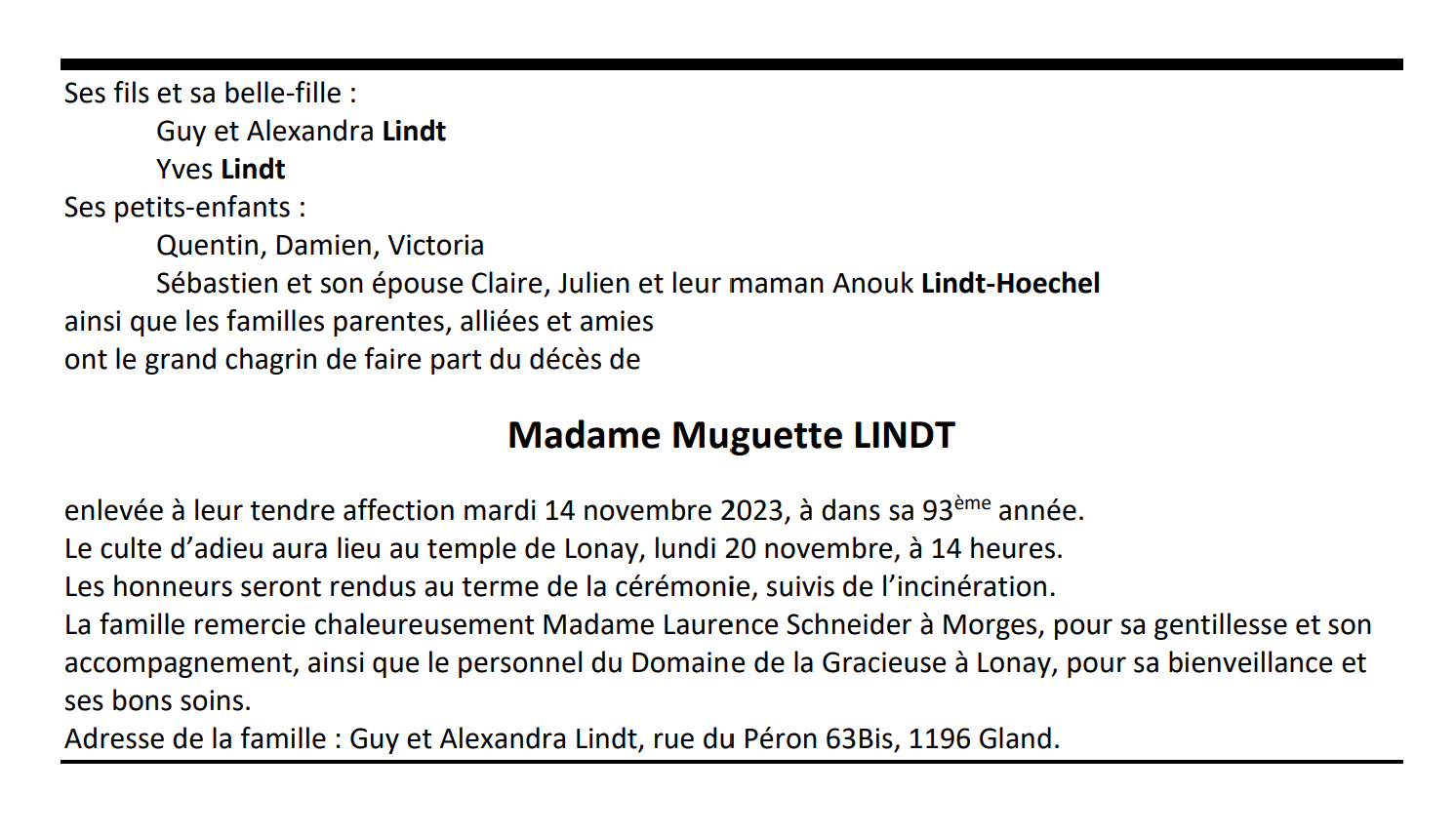Madame Muguette LINDT 24 mai. 1931 - 04 nov. 2023 Avis mortuaire PFG Télecharger PDF Partager sur: Galerie PreviousNext PreviousNext