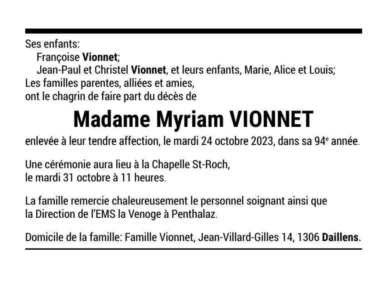 Madame Myriam VIONNET 30 aoû. 1930 - 24 oct. 2023 Avis mortuaire PFG Télecharger PDF Partager sur: Galerie PreviousNext PreviousNext
