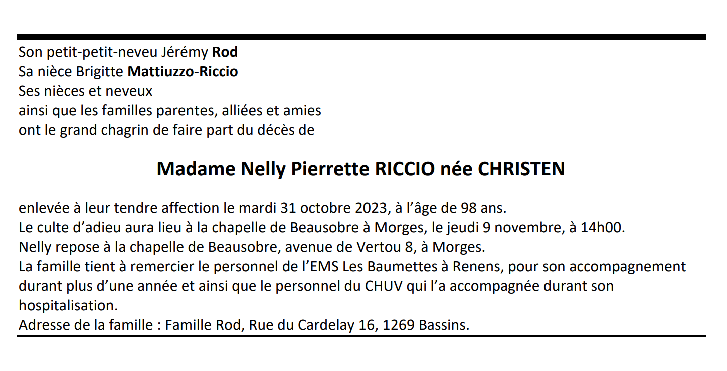 Madame Nelly RICCIO 12 fév. 1925 - 31 oct. 2023 Avis mortuaire PFG Télecharger PDF Partager sur: Galerie PreviousNext PreviousNext