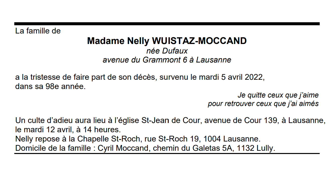Madame Nelly WUISTAZ-MOCCAND 20 jan. 1925 - 05 avr. 2022 Avis mortuaire PFG Télecharger PDF Partager sur: Galerie PreviousNext PreviousNext
