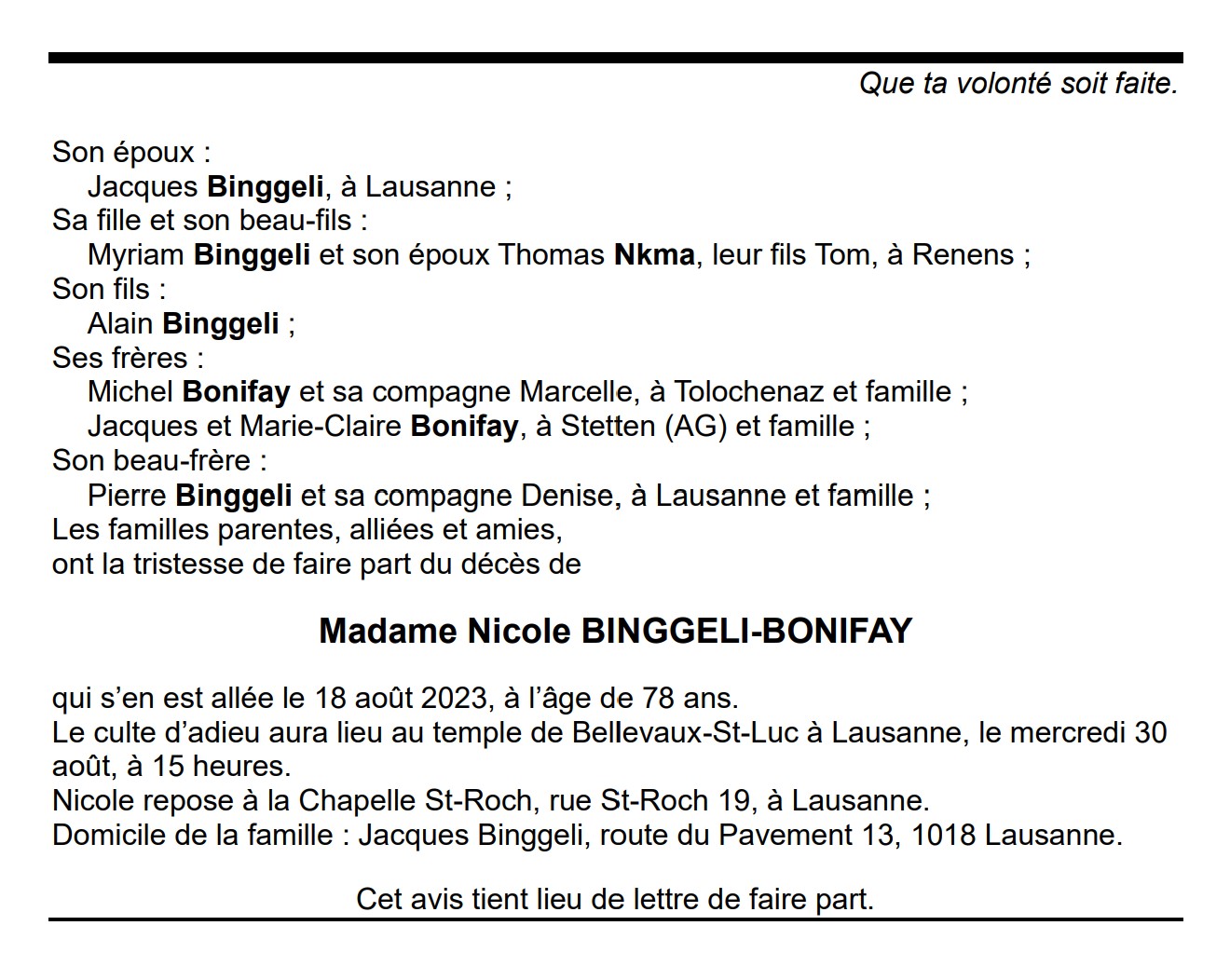 Madame Nicole BINGGELI-BONIFAY 03 mai. 1945 - 18 aoû. 2023 Avis mortuaire PFG Télecharger PDF Partager sur: Galerie PreviousNext PreviousNext