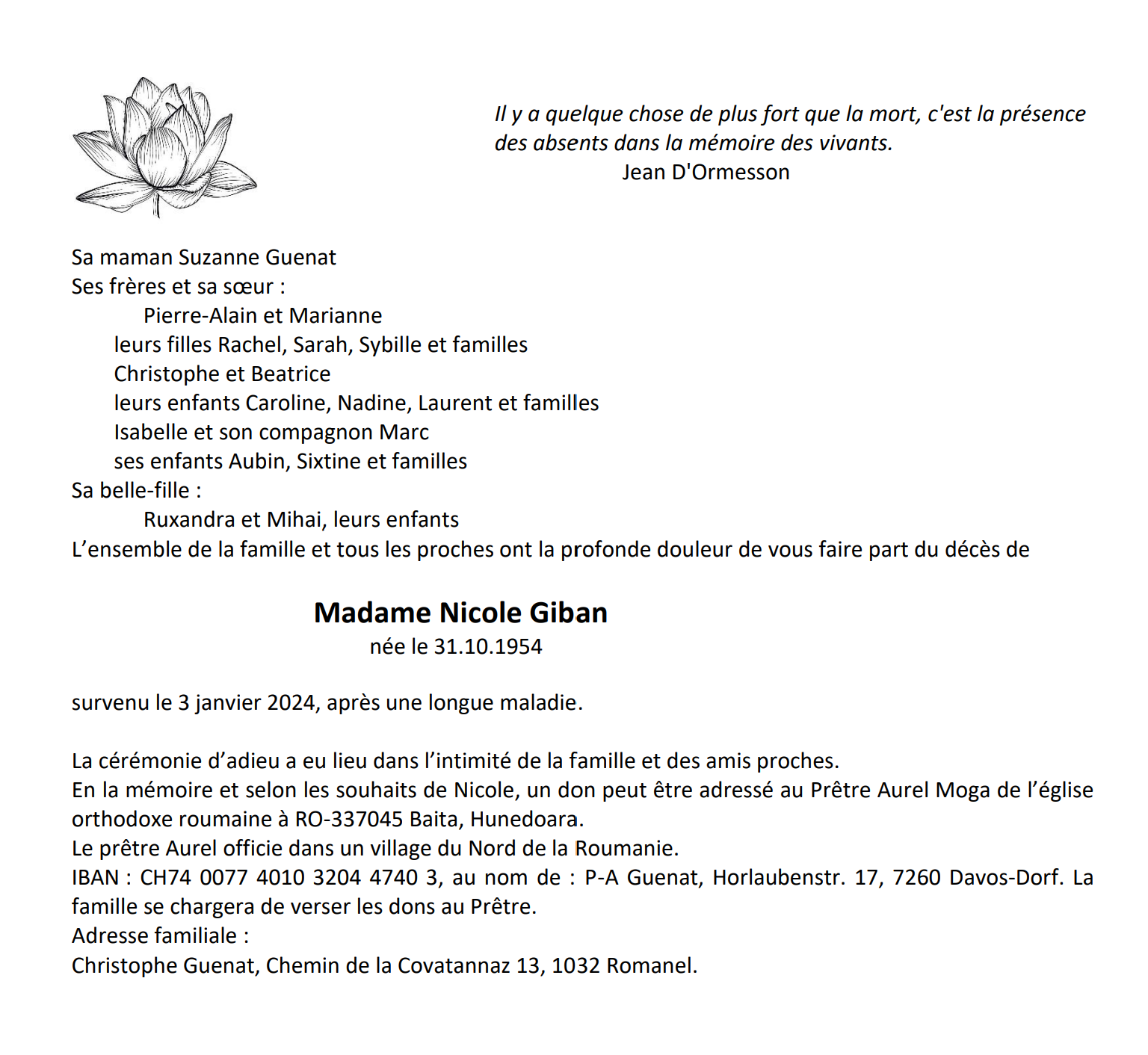Madame Nicole Giban 31 oct. 1954 - 03 jan. 2024 Avis mortuaire PFG Télecharger PDF Partager sur: Galerie PreviousNext PreviousNext