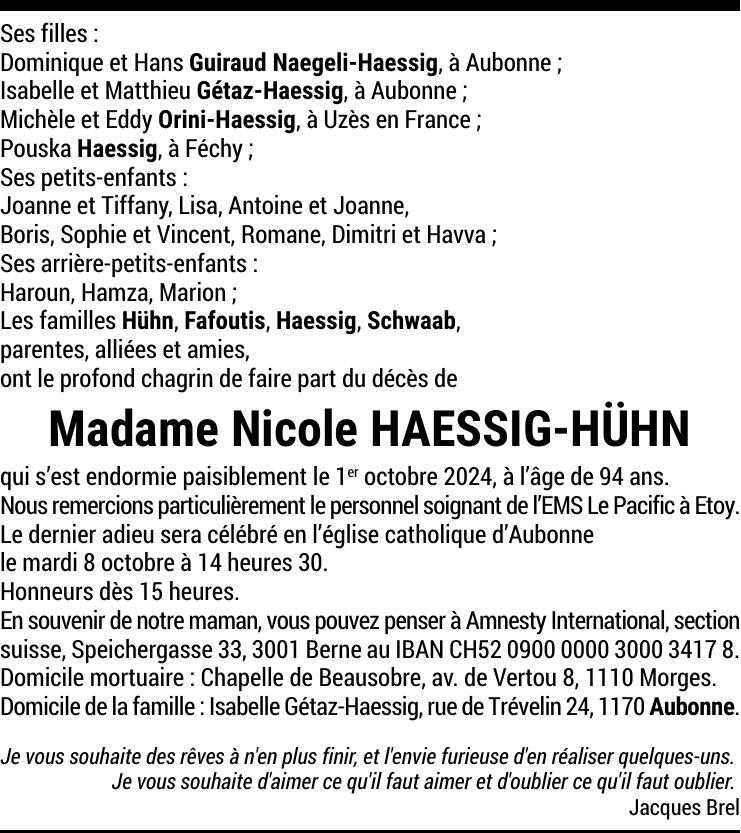 Madame Nicole HÄSSIG 06 mai. 1930 - 01 oct. 2024 Avis mortuaire PFG Partager sur: Galerie PreviousNext PreviousNext