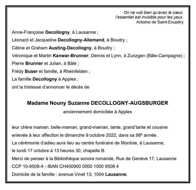 Madame Nouny Suzanne DECOLLOGNY-AUGSBURGER 26 aoû. 1924 - 09 oct. 2022 Avis mortuaire PFG Télecharger PDF Partager sur: Galerie PreviousNext PreviousNext