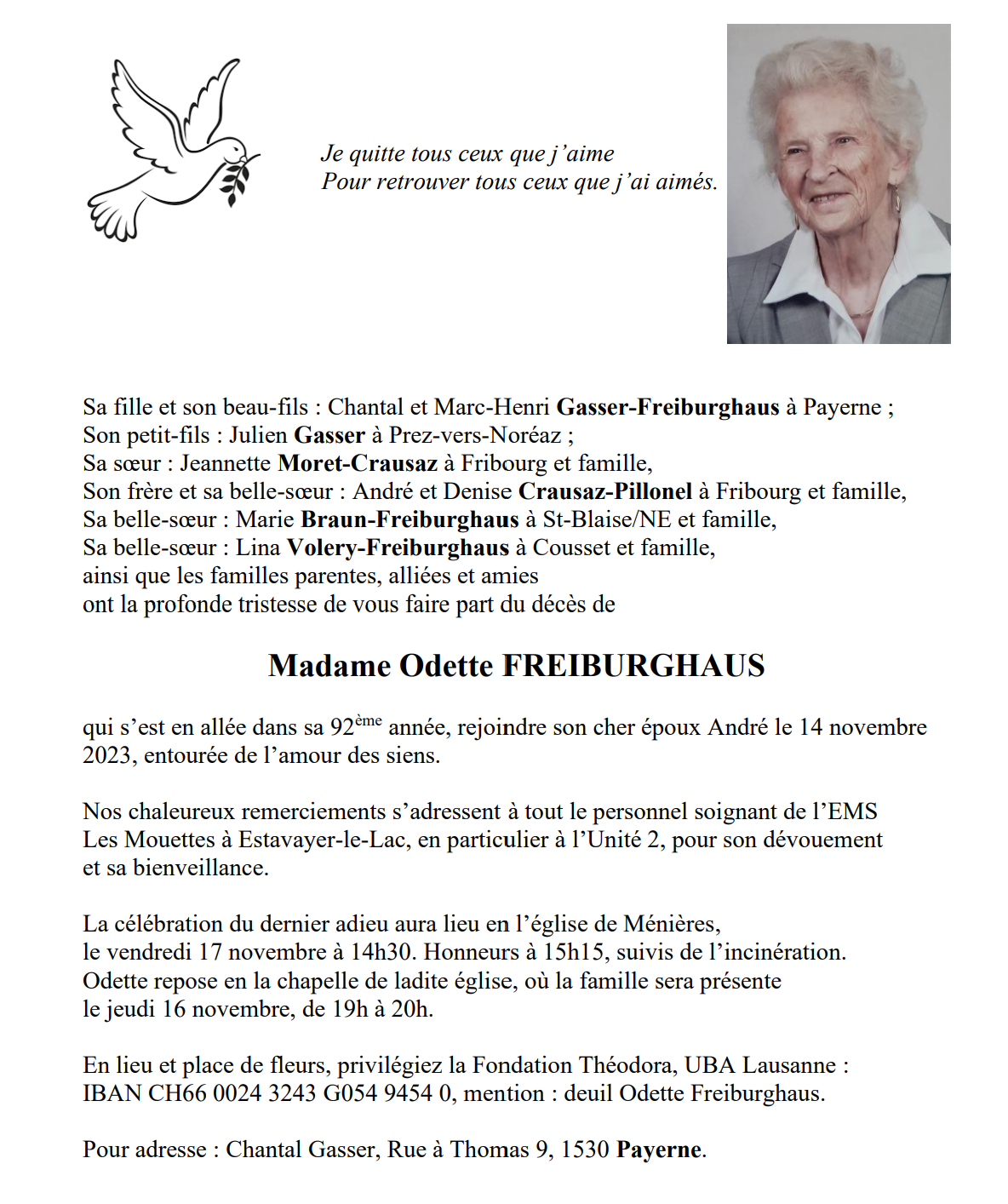 Madame Odette FREIBURGHAUS 28 avr. 1932 - 14 nov. 2023 Avis mortuaire PFG Télecharger PDF Partager sur: Galerie PreviousNext PreviousNext