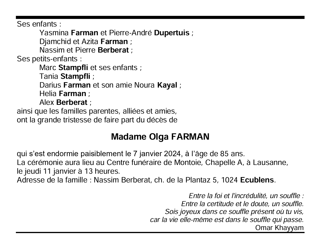 Madame Olga FARMAN 11 juin. 1938 - 07 jan. 2024 Avis mortuaire PFG Télecharger PDF Partager sur: Galerie PreviousNext PreviousNext