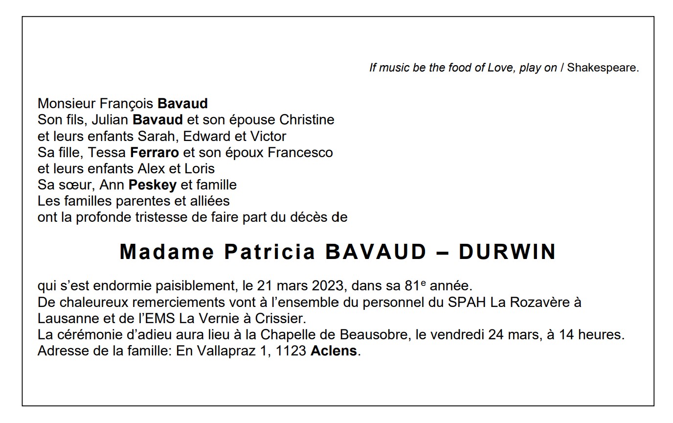 Madame Patricia BAVAUD – DURWIN 24 avr. 1942 - 21 mar. 2023 Avis mortuaire PFG Télecharger PDF Partager sur: Galerie PreviousNext PreviousNext