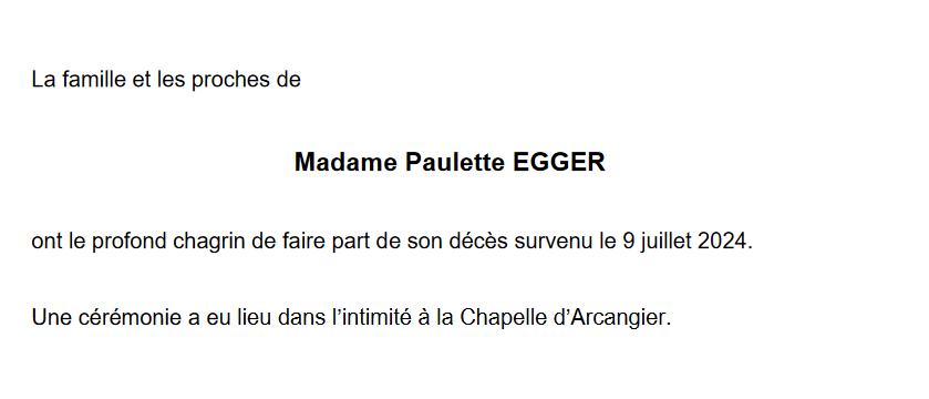 Madame Paulette EGGER 03 mai. 1936 - 09 juil. 2024 Avis mortuaire PFG Télecharger PDF Partager sur: Galerie