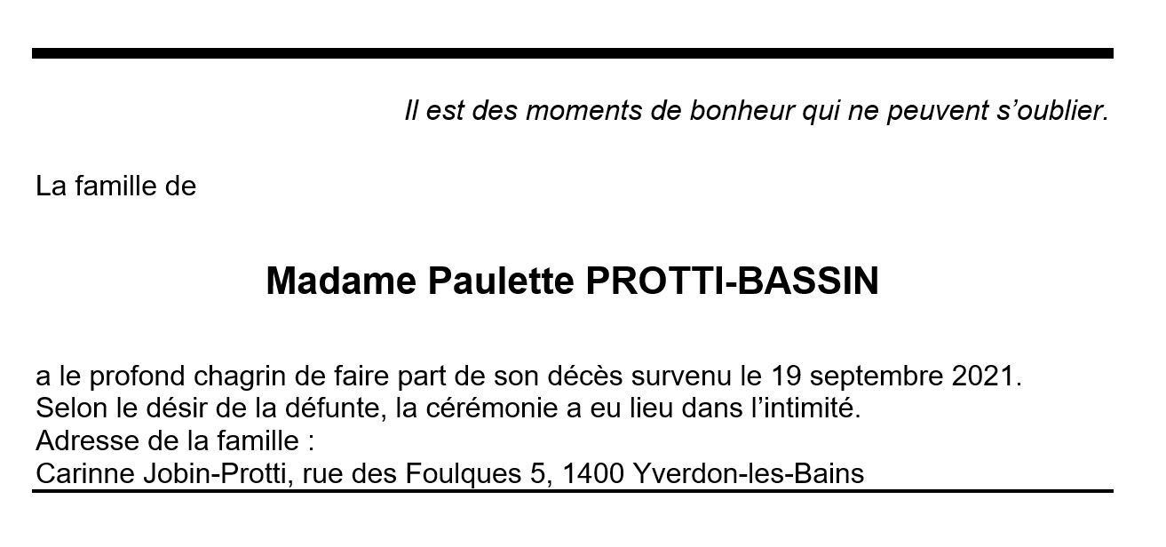 Madame Paulette PROTTI-BASSIN 09 sep. 1927 - 19 sep. 2021 Avis mortuaire PFG Télecharger PDF Partager sur: Galerie