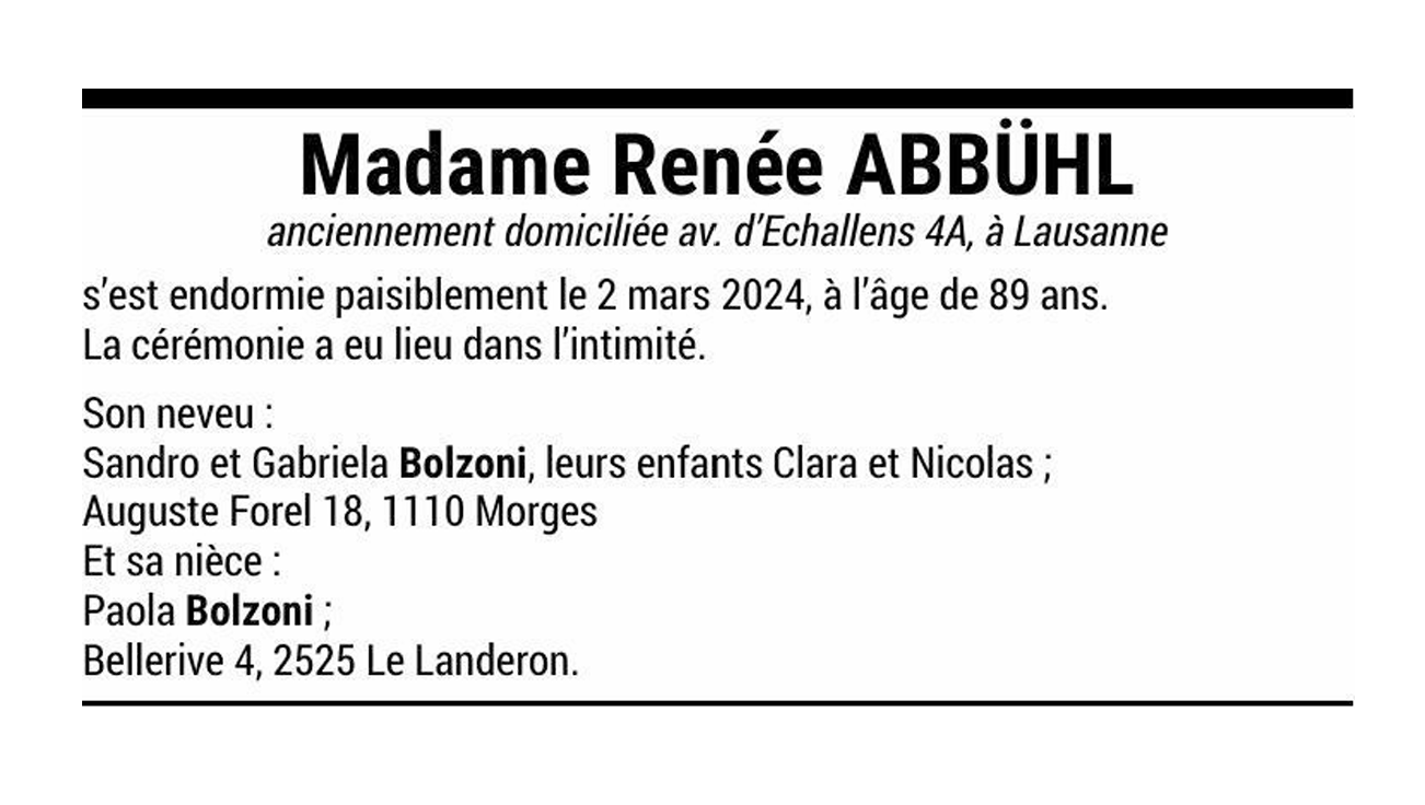Madame Renée ABBÜHL 15 oct. 1935 - 02 mar. 2024 Avis mortuaire PFG Télecharger PDF Partager sur: Galerie PreviousNext PreviousNext