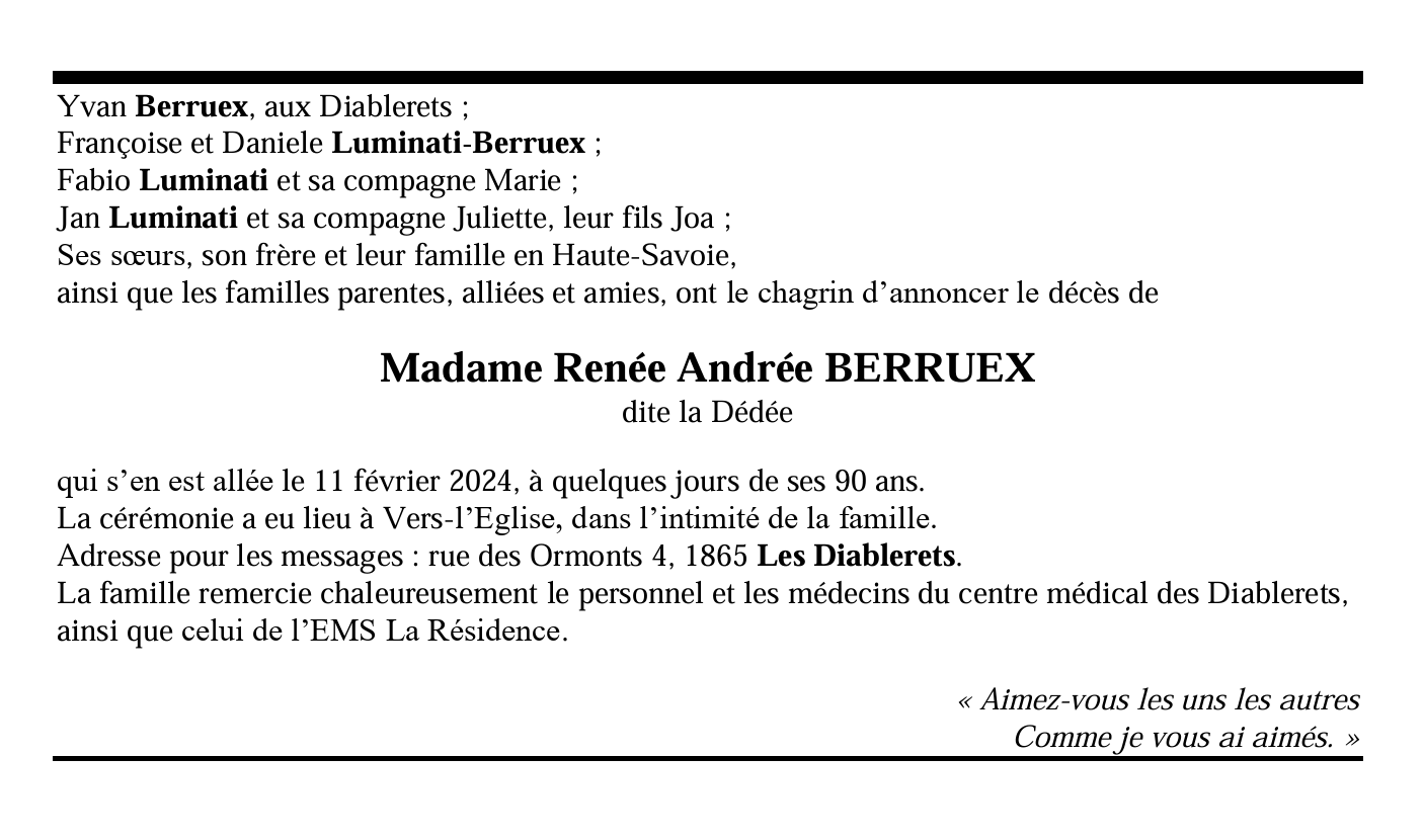 Madame Renée Andrée BERRUEX dite la Dédée 14 fév. 1934 - 11 fév. 2024 Avis mortuaire PFG Télecharger PDF Partager sur: Galerie PreviousNext PreviousNext