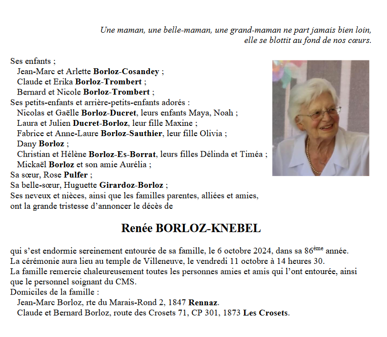 Madame Renée BORLOZ-KNEBEL 16 fév. 1939 - 06 oct. 2024 Avis mortuaire PFG Télecharger PDF Partager sur: Galerie PreviousNext PreviousNext