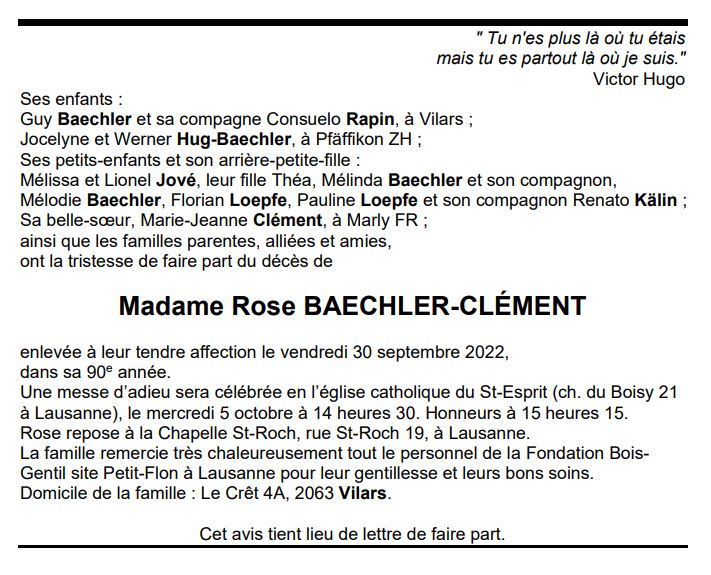 Madame Rose BAECHLER-CLÉMENT 21 avr. 1933 - 30 sep. 2022 Avis mortuaire PFG Télecharger PDF Partager sur: Galerie PreviousNext PreviousNext
