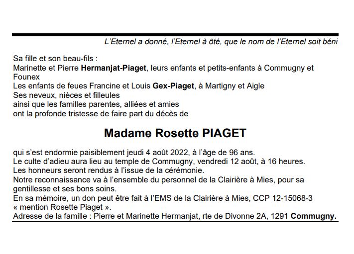 Madame Rosette PIAGET 13 juin. 1926 - 04 aoû. 2022 Avis mortuaire PFG Télecharger PDF Partager sur: Galerie PreviousNext PreviousNext