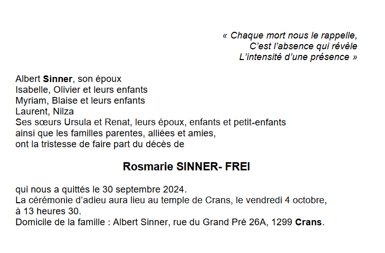 Madame Rosmarie SINNER 02 aoû. 1955 - 30 sep. 2024 Avis mortuaire PFG Télecharger PDF Partager sur: Galerie