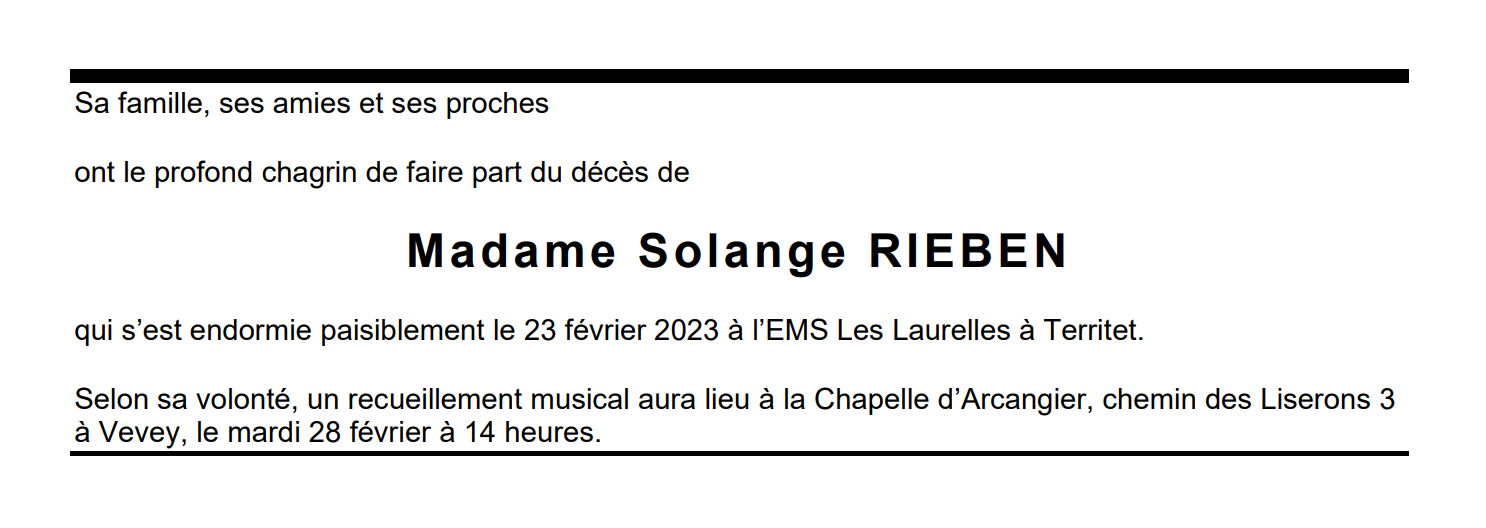 Madame Solange RIEBEN 13 nov. 1943 - 23 fév. 2023 Avis mortuaire PFG Télecharger PDF Partager sur: Galerie PreviousNext PreviousNext