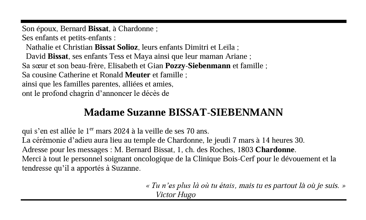 Madame Suzanne BISSAT-SIEBENMANN 29 mar. 1954 - 01 mar. 2024 Avis mortuaire PFG Télecharger PDF Partager sur: Galerie PreviousNext PreviousNext