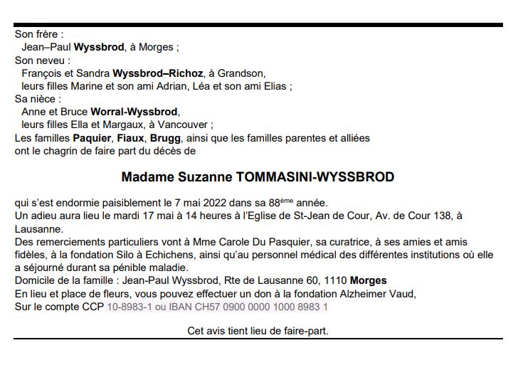 Madame Suzanne TOMMASINI-WYSSBROD 21 aoû. 1934 - 07 mai. 2022 Avis mortuaire PFG Télecharger PDF Partager sur: Galerie PreviousNext PreviousNext