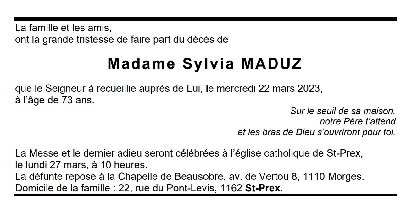Madame Sylvia MADUZ 01 mar. 1950 - 22 mar. 2023 Avis mortuaire PFG Télecharger PDF Partager sur: Galerie PreviousNext PreviousNext