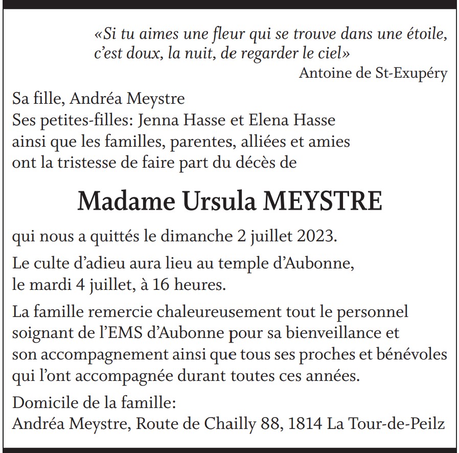 Madame Ursula MEYSTRE 10 aoû. 1937 - 02 juil. 2023 Avis mortuaire PFG Télecharger PDF Partager sur: Galerie PreviousNext PreviousNext