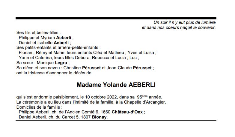 Madame Yolande AEBERLI 25 déc. 1927 - 10 oct. 2022 Avis mortuaire PFG Télecharger PDF Partager sur: Galerie PreviousNext PreviousNext