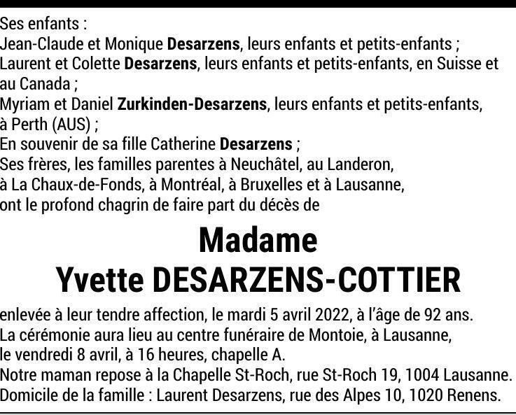 Madame Yvette DESARZENS-COTTIER 16 mar. 1930 - 05 avr. 2022 Avis mortuaire PFG Télecharger PDF Partager sur: Galerie PreviousNext PreviousNext