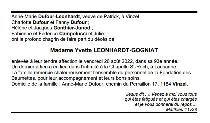 Madame Yvette LEONHARDT-GOGNIAT 07 déc. 1929 - 26 aoû. 2022 Avis mortuaire PFG Télecharger PDF Partager sur: Galerie PreviousNext PreviousNext