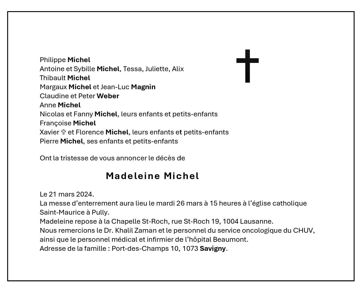 Madeleine Michel 13 jan. 1955 - 21 mar. 2024 Avis mortuaire PFG Télecharger PDF Partager sur: Galerie PreviousNext PreviousNext