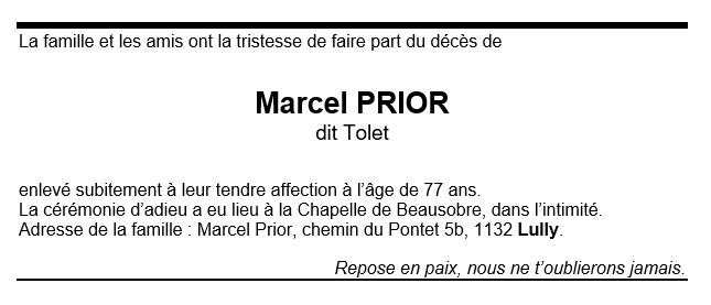 Marcel PRIOR 09 juil. 1944 - 18 nov. 2021 Avis mortuaire PFG Télecharger PDF Partager sur: Galerie PreviousNext PreviousNext