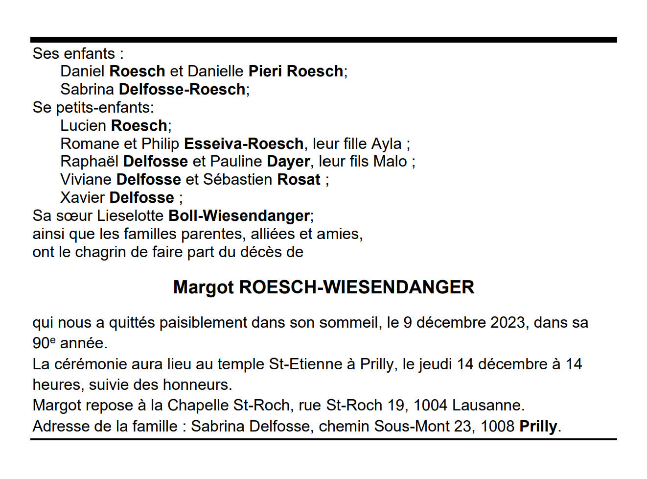 Margot ROESCH-WIESENDANGER 30 jan. 1934 - 09 déc. 2023 Avis mortuaire PFG Télecharger PDF Partager sur: Galerie PreviousNext PreviousNext