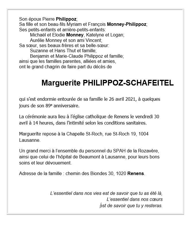 Marguerite PHILIPPOZ-SCHAFEITEL 01 mai. 1932 - 26 avr. 2021 Avis mortuaire PFG Télecharger PDF Partager sur: Galerie PreviousNext PreviousNext