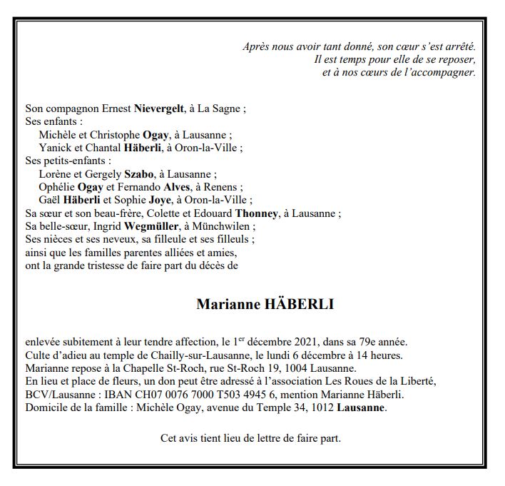 Marianne HÄBERLI 05 juin. 1943 - 01 déc. 2021 Avis mortuaire PFG Télecharger PDF Partager sur: Galerie PreviousNext PreviousNext
