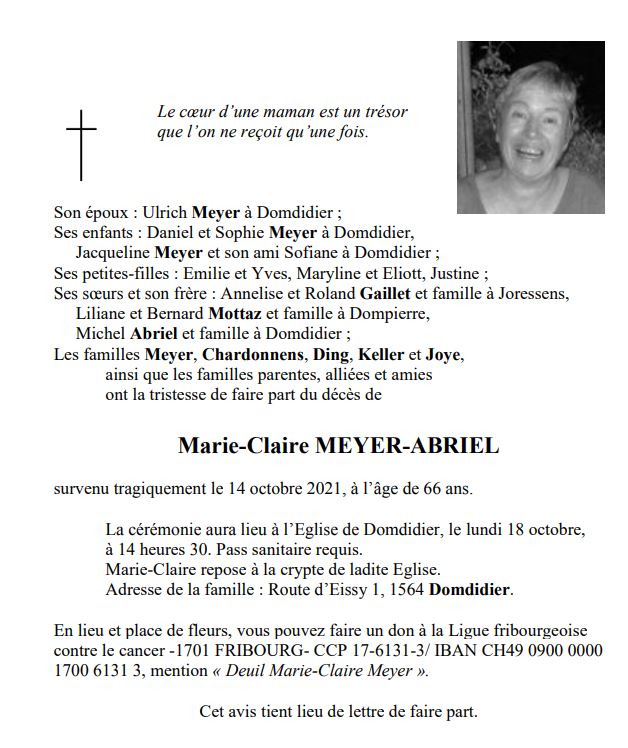 Marie-Claire MEYER-ABRIEL 08 juin. 1955 - 14 oct. 2021 Avis mortuaire PFG Télecharger PDF Partager sur: Galerie PreviousNext PreviousNext