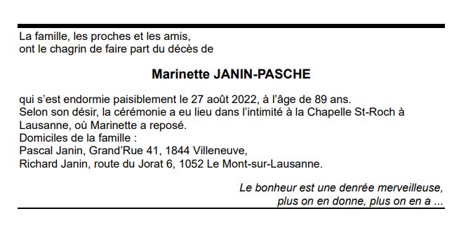 Marinette JANIN-PASCHE 24 avr. 1933 - 27 aoû. 2022 Avis mortuaire PFG Télecharger PDF Partager sur: Galerie PreviousNext PreviousNext