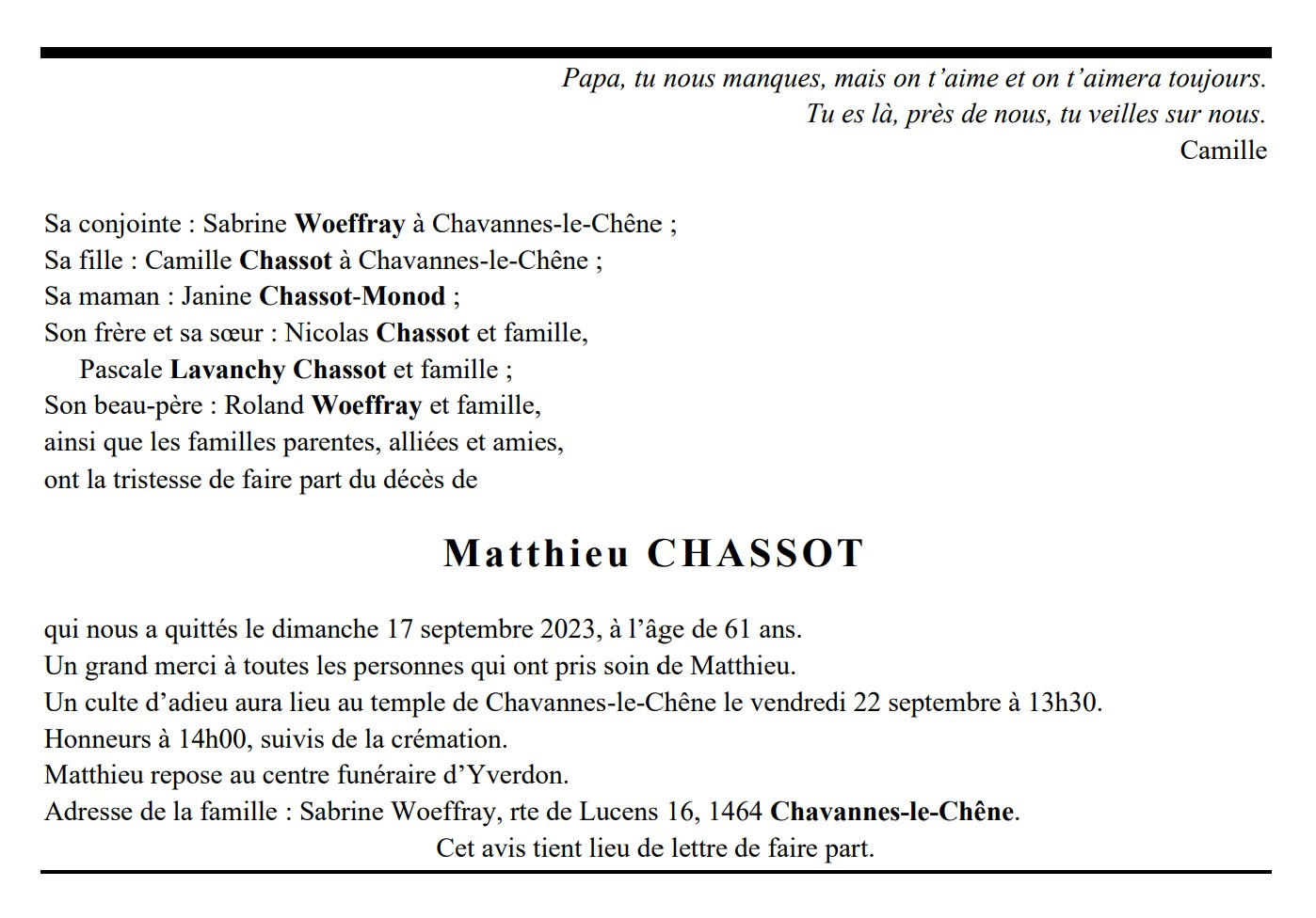 Matthieu CHASSOT 08 fév. 1962 - 17 sep. 2023 Avis mortuaire PFG Télecharger PDF Partager sur: Galerie PreviousNext PreviousNext