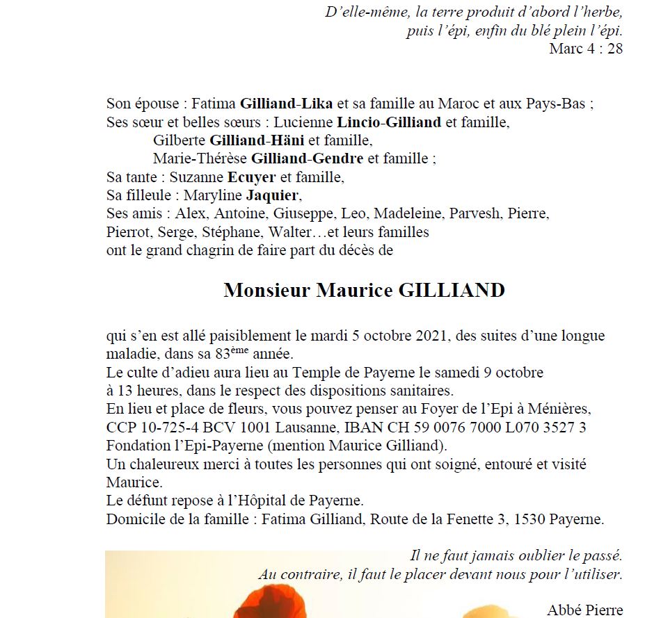 Maurice GILLIAND 12 mar. 1939 - 05 oct. 2021 Avis mortuaire PFG Télecharger PDF Partager sur: Galerie PreviousNext PreviousNext