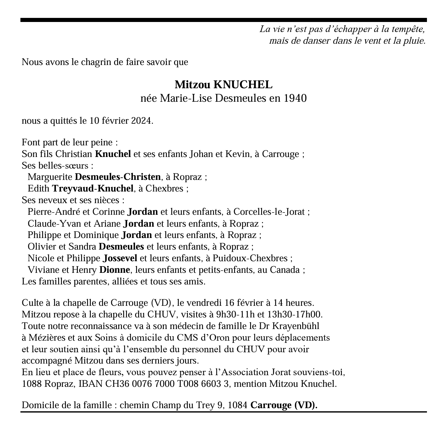 Mitzou KNUCHEL née Marie-Lise Desmeules 28 juil. 1940 - 10 fév. 2024 Avis mortuaire PFG Télecharger PDF Partager sur: Galerie PreviousNext PreviousNext