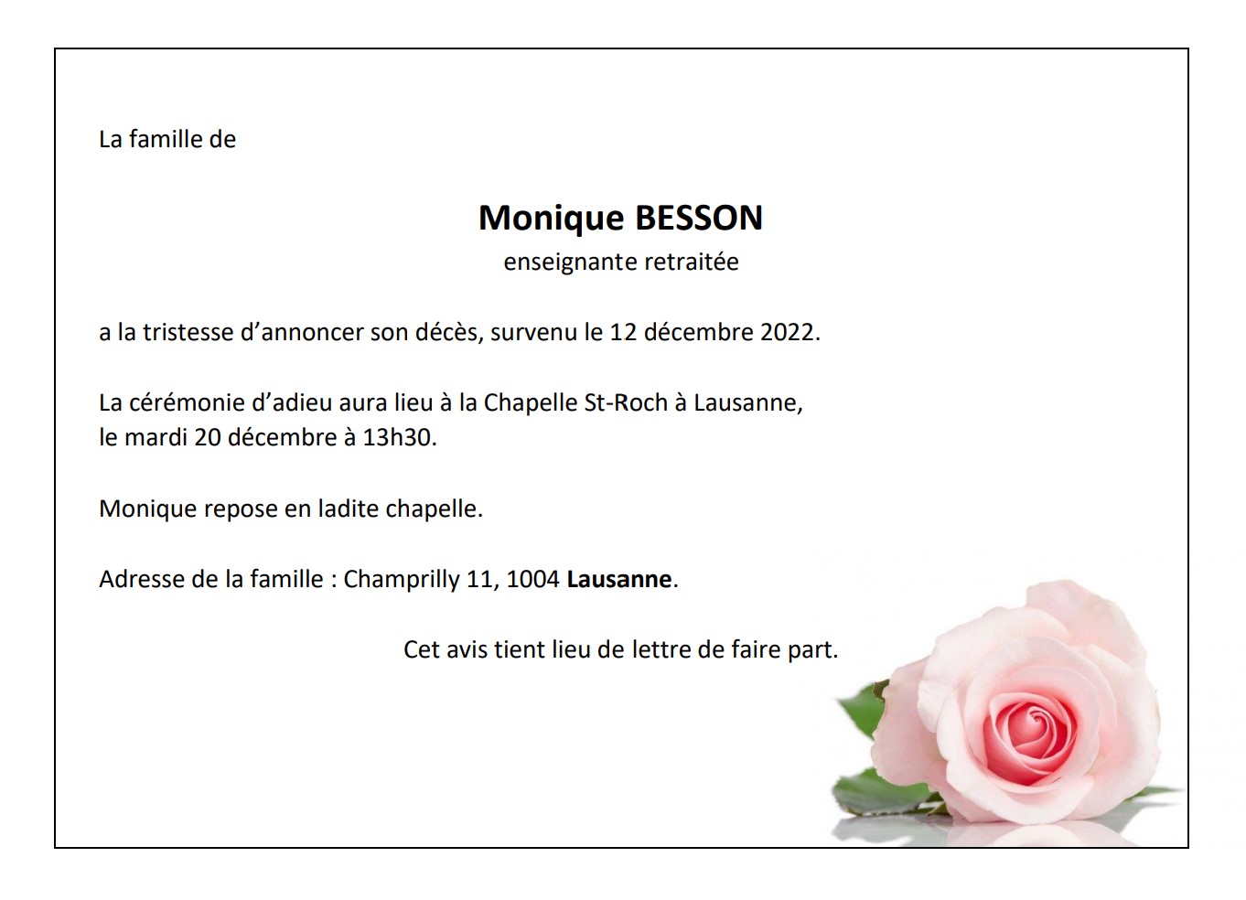 Monique BESSON 15 nov. 1948 - 12 déc. 2022 Avis mortuaire PFG Télecharger PDF Partager sur: Galerie PreviousNext PreviousNext