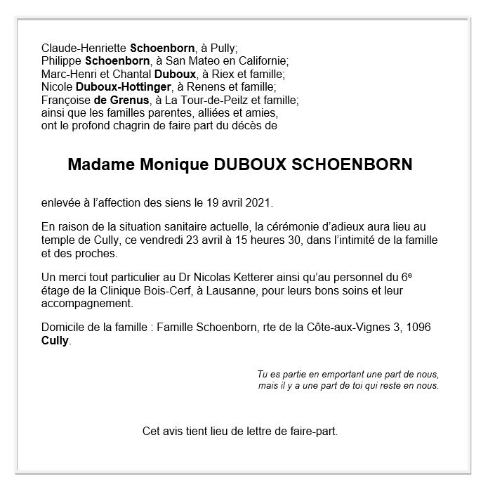 Monique DUBOUX-SCHOENBORN 19 avr. 2021 Avis mortuaire PFG Télecharger PDF Partager sur: Galerie PreviousNext PreviousNext