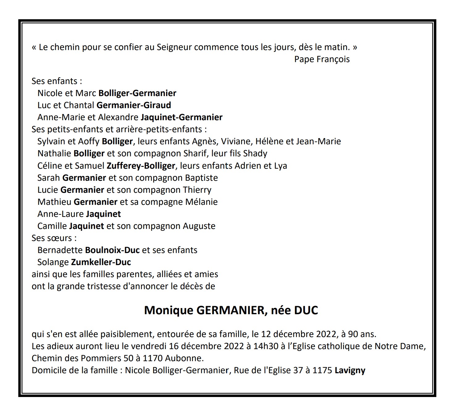 Monique GERMANIER 30 juin. 1932 - 12 déc. 2022 Avis mortuaire PFG Télecharger PDF Partager sur: Galerie PreviousNext PreviousNext